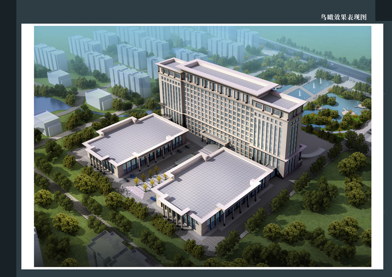 項目基地位于臨沭縣,四至均為政府規(guī)劃道路,交通及自然條件良好。本方案由辦公大樓、會議廳及公共配套服務(wù)三個主要體量構(gòu)成。建筑師以地理位置劃分基地,既區(qū)分場所性質(zhì)的內(nèi)外之別,南北高低不同。以一高兩低的三個模塊,組織空間?;啬蟼?cè)與城市主干道聯(lián)系緊密,故把辦公大樓這一公共性強的功能排布在此,形成U型的多層建筑體量,舒展大氣。同樣,將功能性相對私密的辦公功能布局在基地的南邊。高層辦公樓,標準層平面呈U型,最大程度地爭取陽光及南向自然景觀。餐廳、咖啡茶座等公共配套服務(wù)用房則設(shè)置在前兩者的之間,以景觀草坡的形態(tài)展現(xiàn),既有效的組織了人流,又改善了公共空間品質(zhì)。
