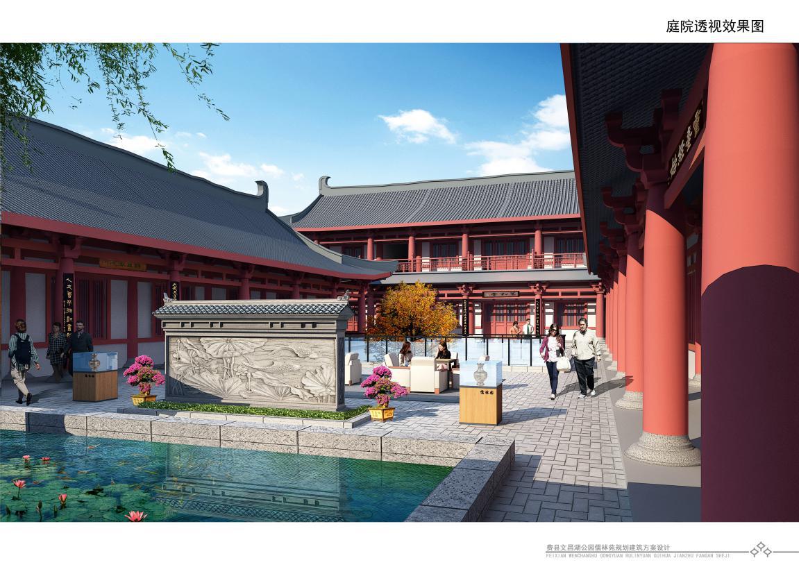 文昌湖公園位于費縣自由路上,地處河邊。而儒林苑則是在文昌湖公園里修建的一處休息用的庭院。該處庭院在設(shè)計初期選擇了多種建筑樣式,最后定格在四合院的建筑風格上。