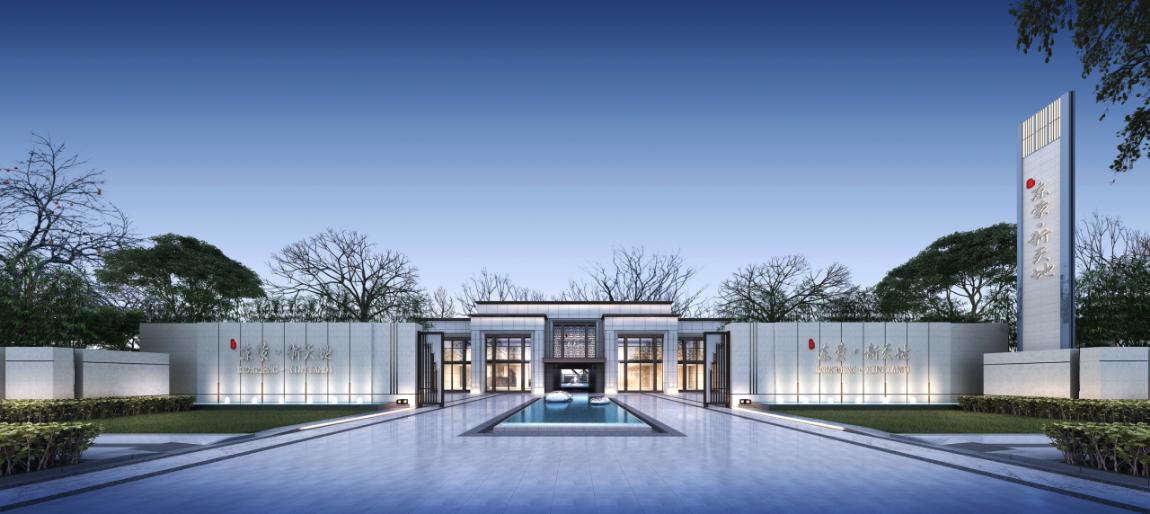 將大門與小區(qū)會所功能相結(jié)合,利用大挑板具有縱向延伸感,增加入口的恢弘氣勢,結(jié)合周邊帶有中式元素的景墻,形成一個有序整體。